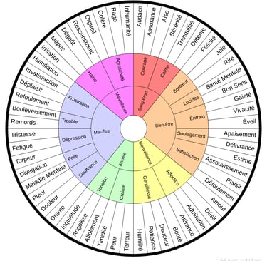 La roue des émotions est une représentation circulaire des différentes émotions humaines. Elle s’organise généralement autour d’émotions dites “primaires” (comme la joie, la peur, la colère, la tristesse, la surprise ou le dégoût), puis se décline en émotions plus précises et nuancées.